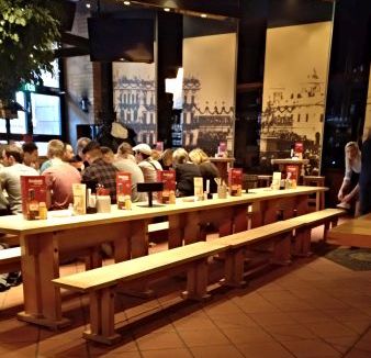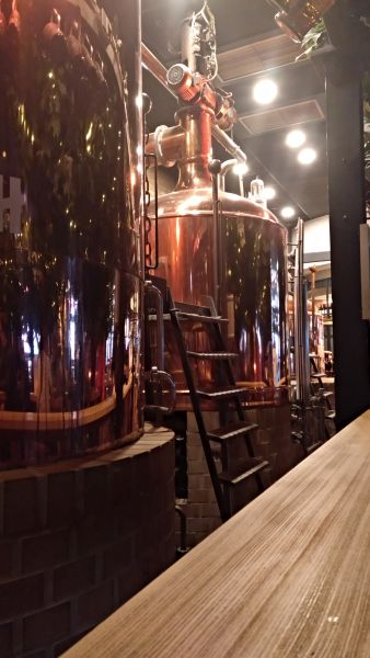 Im Brauhaus kann man recht gemütlich sitzen. Auf der rechten Seite gibt es ein Café. Dort stehen kleine Tische aus hellem Holz mit Tischdecken. Auf der linken Seite befinden sich rustikale Tische für große Gruppen als auch Tische mit Barhockern. Man hat direkten Blick auf die großen kupferfarbenen Bierkessel. In dem Bereich gibt es auch Tische für größere Gruppen. Außerdem gibt es am Wochenende spät abends Live-Musik.