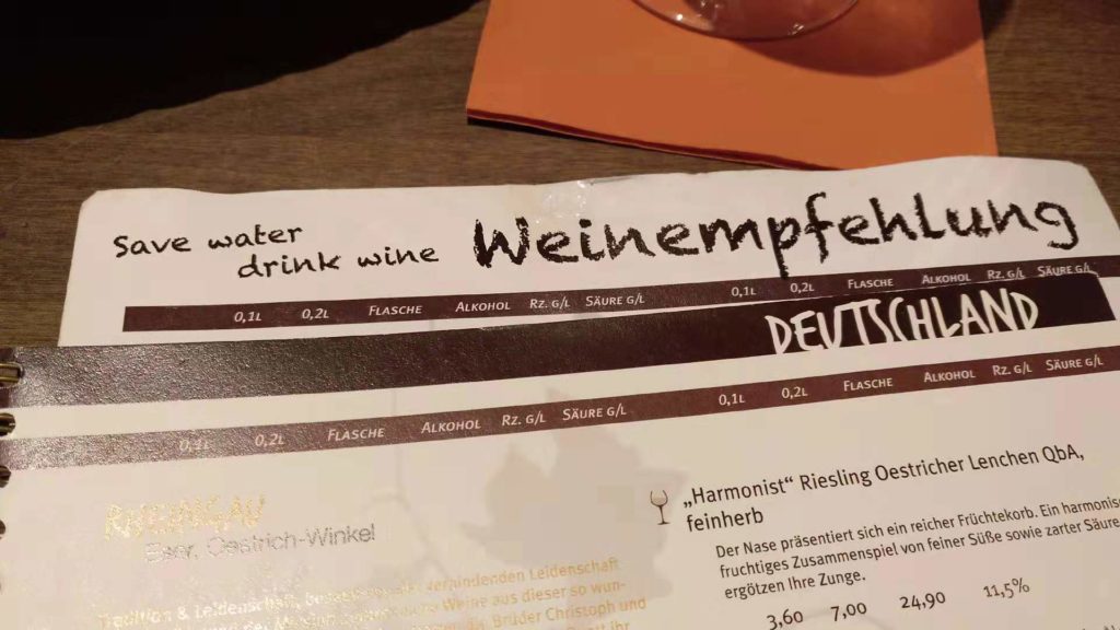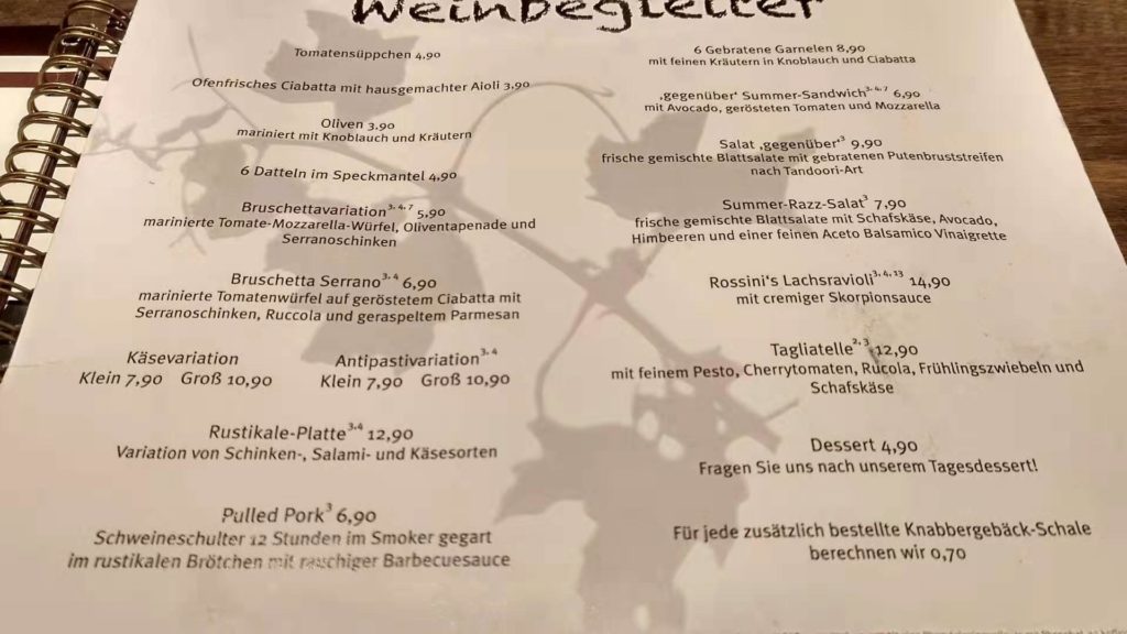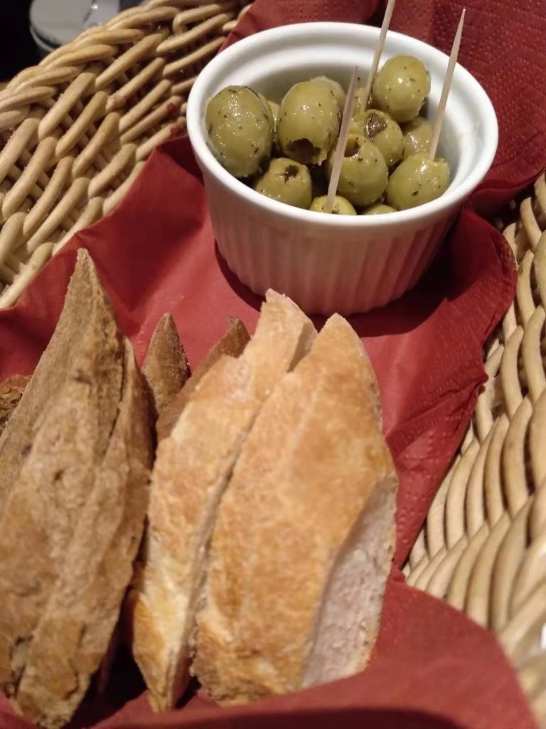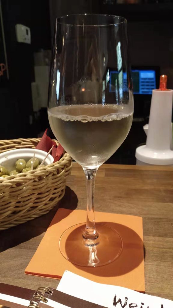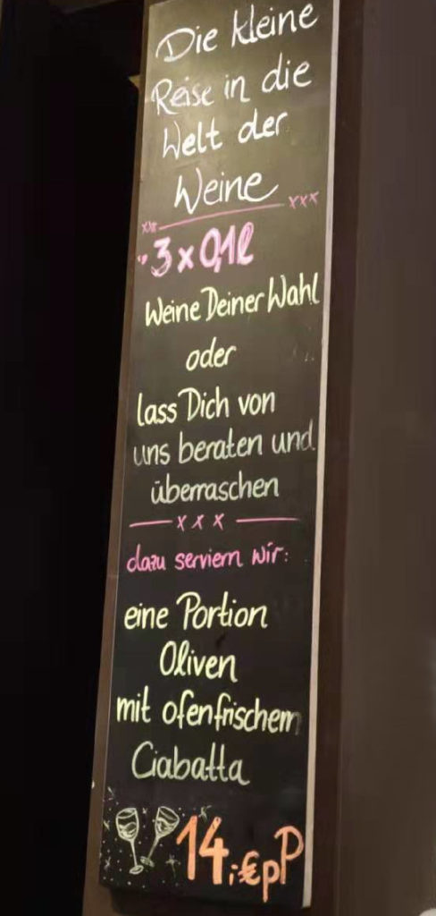 Ich hatte heute das Angebot „die kleine Reise in die Welt der Weine“ bestellt. Sehr zu empfehlen für Leute, die sich einfach mal duchprobieren möchten und richtig gute Oliven mit Chiabatta essen wollen. Sehr zu empfehlen. Die Bedienung hilft einem bei der Auswahl der Weine. Allerdings waren mir persönlich 300 Milliliter Wein zu viel. Also verschiedene Weine zu je 100ml.