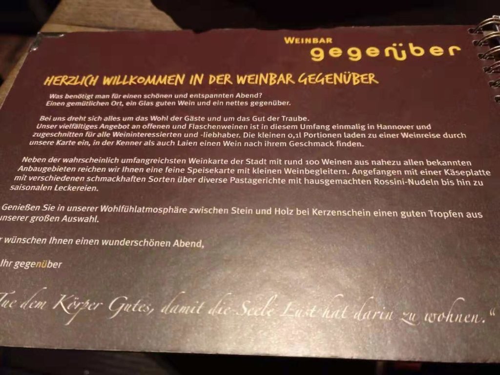 Das kleine Weinlokal mit diversen deutschen und internationalen Weinsorten lädt zum Probieren ein. Wer guten Wein liebt, sollte hier auf jeden Fall mal vorbei schauen. Das Lokal ist sehr gemütlich, die Beilagen schmecken ausgezeichnet und man bekommt eine prima Beratung. Man kann ein wenig probieren, sich umentscheiden und nachfragen. Es gibt Wein in Flaschen oder im Glas zu 100/200ml.